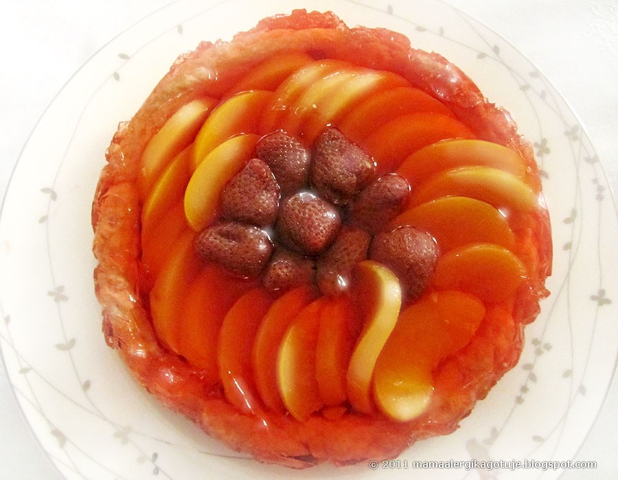 - Wyjąć z piekarnika ostudzić, rozłożyć owoce, zalać już tężejącą galaretką i schodzić aż galaretka stężeje do końca