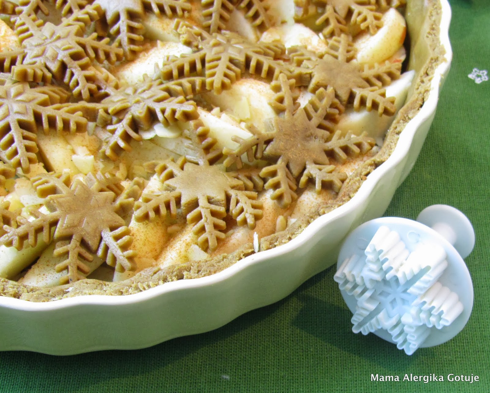 - Drugą część ciasta cienko rozwałkowujemy (2 mm), wykrawamy śnieżynki i układamy je na jabłkach.