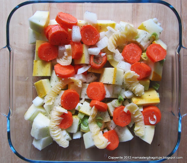 - Wszystkie warzywa, umyte, obrane, pokrojone w mniejsze kawałki umieszczamy w naczyniu żaroodpornym, solimy, pieprzymy i obkładamy płatkami masła klarowanego (lub polewamy oliwą 1-2 łyżki)